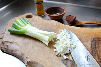 サツマイモを蒸している間に長ネギを粗みじん切りにする。 -