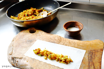 - 春巻きの皮には裏と表があります。ツルツルとしている方が表なので、巻く時にはそちらを下にセットします。