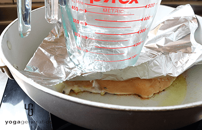 フライパンにオリーブオイルを多めに加えて中強火にする。1の鶏肉を入れ上からアルミホイルをかぶせる。耐熱性の重たいもの(水を入れたヤカンや鍋などでも良いですね!)をアルミホイルをかぶせた鶏肉の上に乗せて中強火のままで加熱、両面にこんがりと焼き色をつける(この時点で完全に火が通っていなくてもOK) -