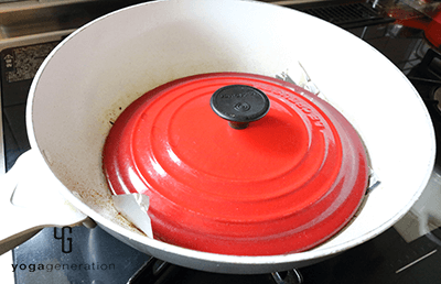 最後に一気に強火にしたらすぐに火を止めて蓋をし、そのまま置いて余熱で火を通す。 -