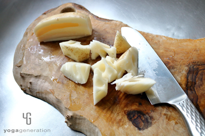 レンコンをよく洗い、皮付きのまま一口大に切る。 -