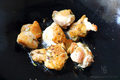 フライパンにエキストラヴァージンオリーブオイルを多めに注ぎ、中強火で熱する。オイルが熱くなったら鶏肉を皮側から焼き始める。皮がカリッとし、こんがりとした色がついたらひっくり返してもう片面を焼く。 -