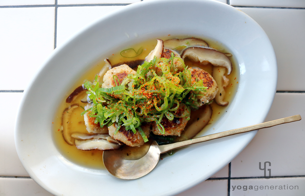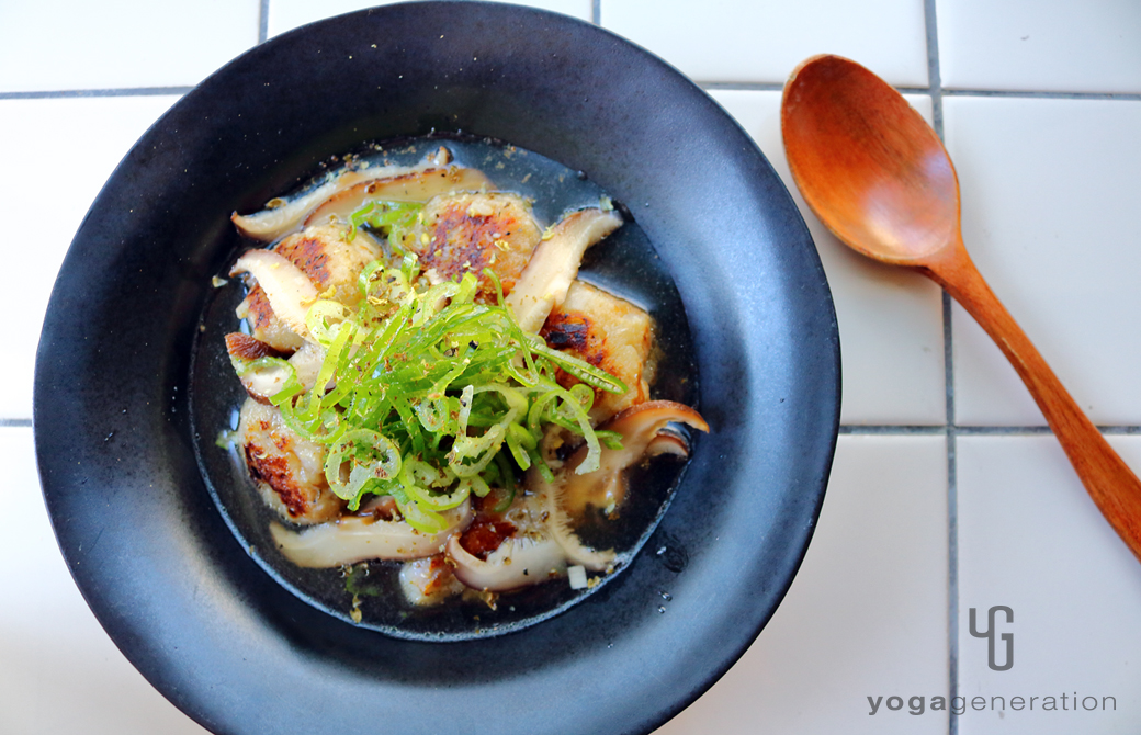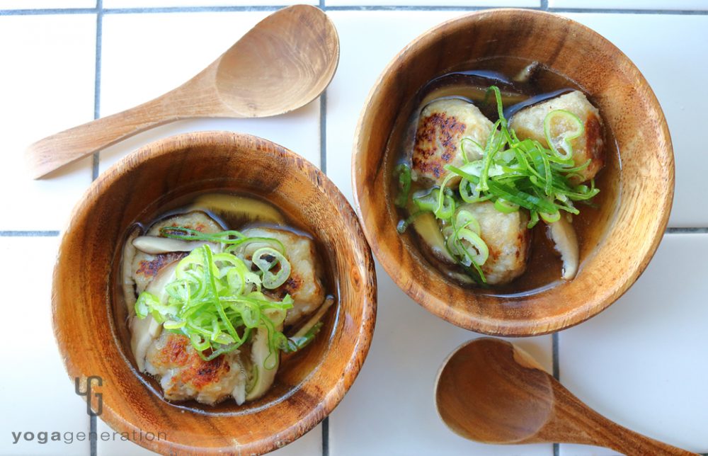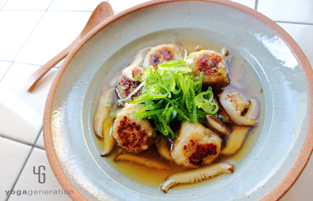器に4の団子を盛り付けて5のスープを注ぎ、長ネギの薄切りを添える。好みで七味唐辛子や山椒を添える。