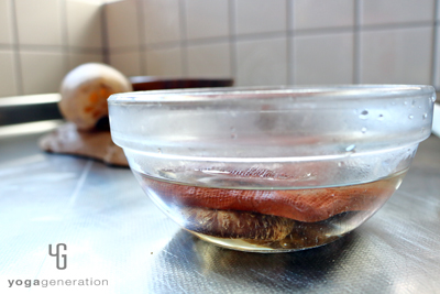 干し椎茸はお湯(分量外)につけて上から重石(小皿など)をし戻す。戻したらカサと軸を切り離し、カサは薄切り、軸はみじん切りにする。 -