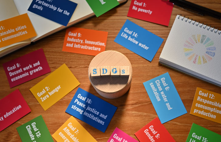 SDGsは、2015年に国連加盟国の全会一致で採択された「Sustainable Development Goals(持続可能な開発目標)」の略称です。気候変動対策・平和・雇用のあり方・イノベーションなど、国際社会共通の2030年までの目標を掲げ、持続可能でよりよい世界を目指しています。