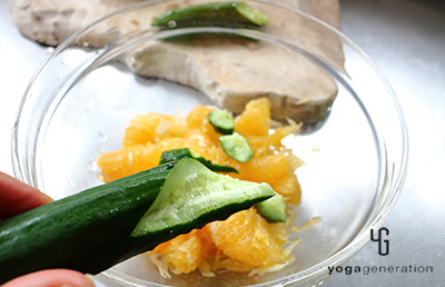 さらに明るさを加えてレモンを思わせるような黄色。夏みかんの色とは統一感を、そしてミントやキュウリの緑が躍動感を思わせるアクセントに!