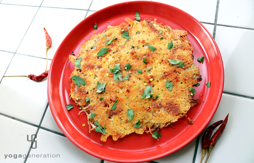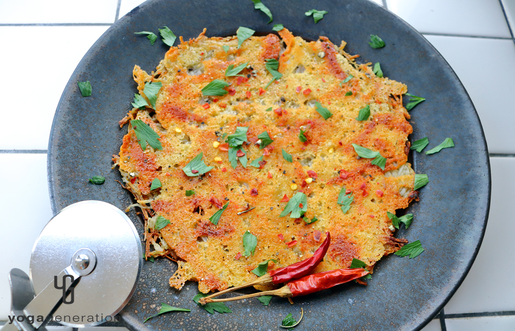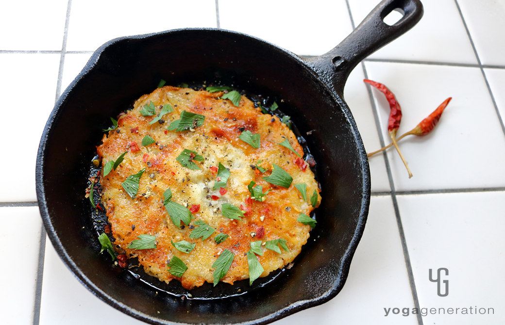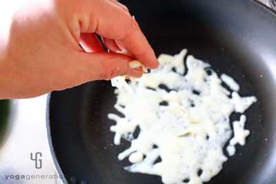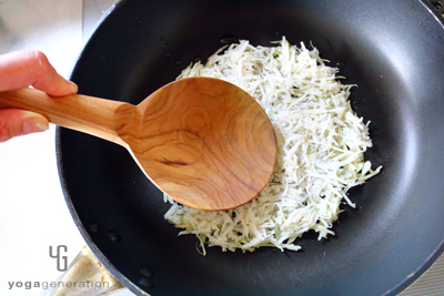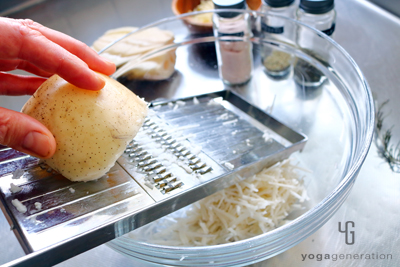 でんぷん質が多いレンコンは、同じくでんぷん質が多いジャガイモのハッシュ・ブラウン同様に加熱することによってお互いがくっ付き合います。また、今回はそこにチーズをプラスすることによって更にまとまりが良くなります。