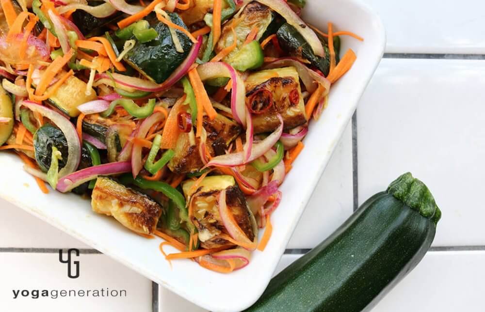 色々な野菜たちが入ることでカラフルでポップな色合いに!トロトロした舌触りのズッキーニと、千切りしたシャキシャキ食感の野菜たちのコントラストも、口の中で楽しいハーモニーを醸し出してくれます。