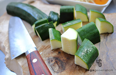 ズッキーニを一口大にカット。火入れをすると小さくなるので、少し大き目がおすすめです。 -