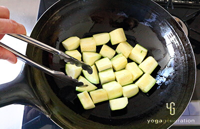 鍋に1を入れて少しづつゴマ油を回しかけ、上下を返しながら全体にオイルを絡ませる。ズッキーニの皮目を下にして中弱火で加熱を始める。皮の内側の身がしんなりしてきたら(半透明色になってくる)強火にし、ズッキーニを返し、焼いていない面をこんがり焼く。 -