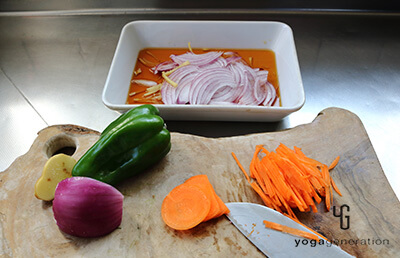 2でズッキーニの皮面を焼いている時に漬け汁を作る。バッドもしくはそこが広いお皿に☆の材料を混ぜ合わせ、残りの材料の野菜たちを全て千切りに、輪切り唐辛子も加えて全体を混ぜ合わせる。 -