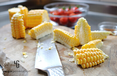トウモロコシは長さを4等分し、さらに縦に4等分にカットする。 -
