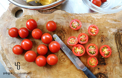 トウモロコシの黄色とトマトの赤色が映えますね!ビビットな赤色の器からはエネルギーをもらえます。