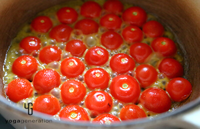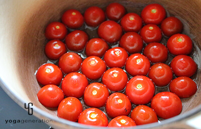 鍋にゴマ油をひと回しし、ミニトマトの断面を使いながら鍋底にゴマ油を広げるようにトマトを並べる。 -