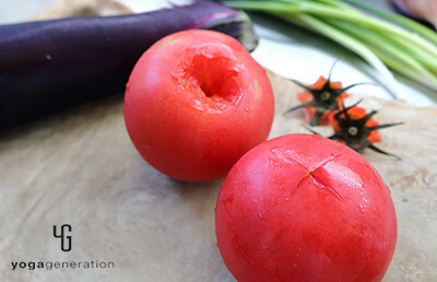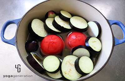 トマトはヘタをくり抜き、お尻の皮の部分だけに十文字を入れる。ナスは1cm幅の輪切りにする。 -