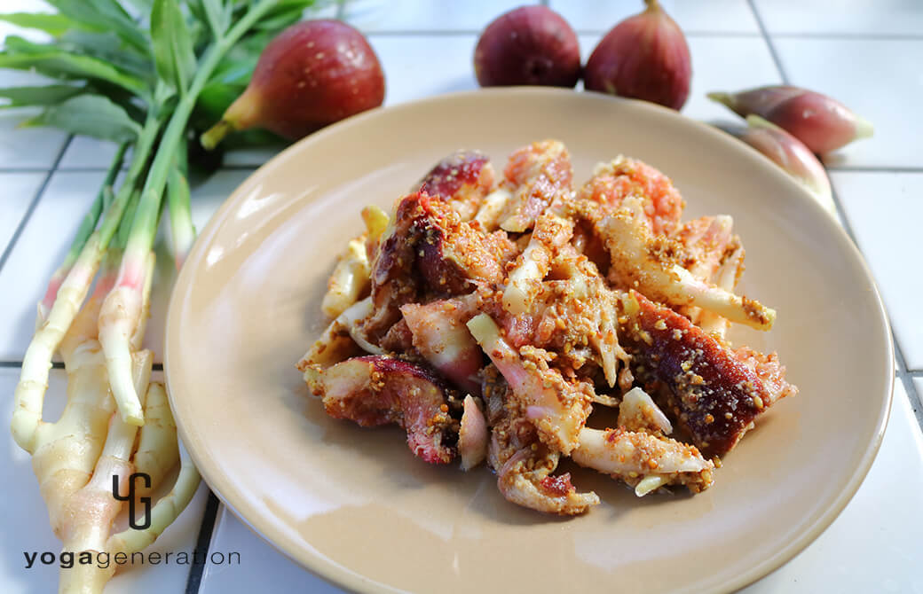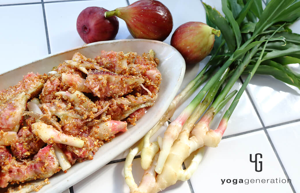 イチジクを手で割く。手で割くことによって和え衣が優しく絡み合う。ミョウガは縦半分にカットしてから薄くスライスする。ショウガは、包丁で軽く削ように硬い皮の部分のみを除く。 -