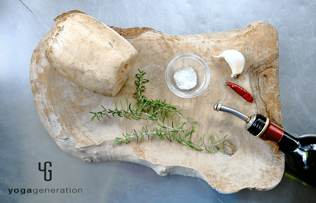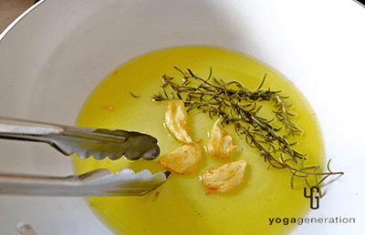 フライパンにオリーブオイルと①のニンニク、ローズマリーを入れて極弱火で熱する。美味しそうな香りがしてきたらニンニクとローズマリーを取り除いて取っておく。 -