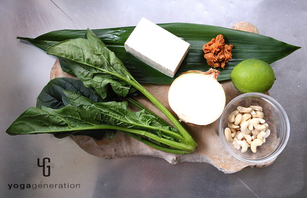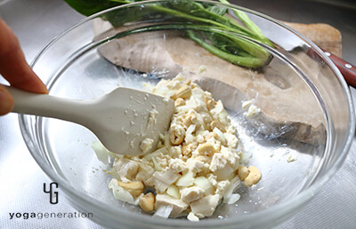 鍋にひとつまみの塩(分量外)を加え、湯を沸かし始める(ホウレン草を茹でる用)。ホウレン草は根元に切り込みを入れ、土が付いていたら洗い流しておく。その間にボウルに絹豆腐を手で崩し入れる。そこに粗みじん切りにしたタマネギ、カシューナッツ、少量の味噌を加え、ざっくり混ぜ合わせておく。