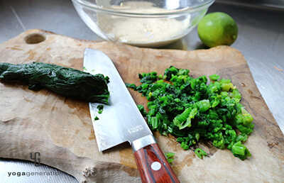 あく抜きしたホウレン草を1cm弱にザク切りし、しっかりと水気を絞って2の豆腐ペーストに加え混ぜ合わせる。ライム果汁を絞り入れ、味見をしながら必要であれば味噌を加えて味わいを調える。