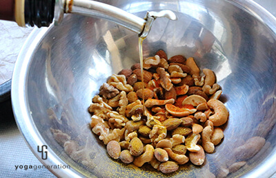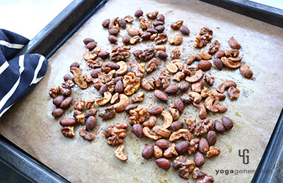 180度に予熱しておいたオーブンの中へ1を入れ10〜13分ほど焼く。途中、スパイスの香りがしてきたら一旦取り出し、全体を混ぜ合わせ、再度広げて焼く。(焦げやすいので、10分過ぎたあたりからはオーブン内をよくチェックしてください。)ナッツの端が色づき始めたら直ぐに取り出し、もう一度よく混ぜ合わせたら、そのまま置いて冷ましておく。 -