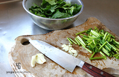 ホウレン草は根元・茎と葉の部分に分けたまま、それぞれを4〜5cmにカットする。ニンニクは包丁の腹などで潰してから薄切りにする。 -
