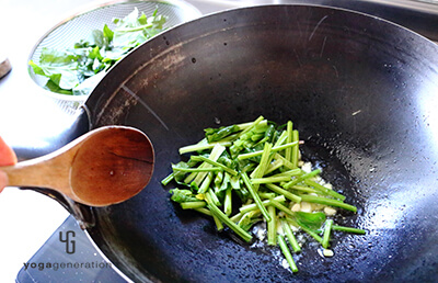 さらに一気にホウレン草の葉の部分を加えて塩胡椒を加え、鍋肌から☆(バルサミコ酢・醤油)を回しかけ全体をざっと混ぜ合わせたら直ぐに火を止め、余熱でホウレン草に火を通す。