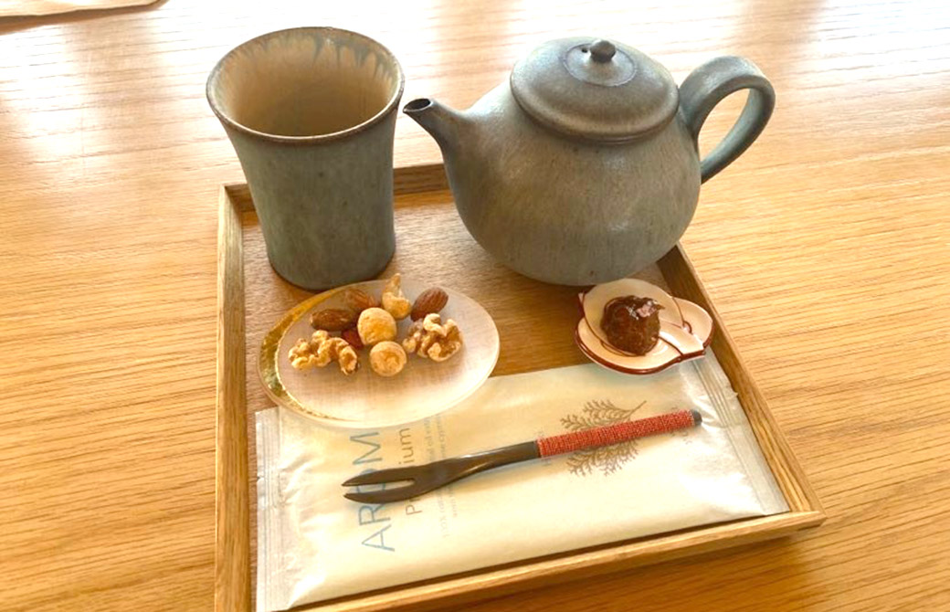 ウェルカムドリンクは、三年番茶。三年番茶は熟成の途中でカフェインやタンニンなどの刺激物が抜けるため、体に優しいということで有名ですよね。香ばしい香りで、リラックスすることができます。