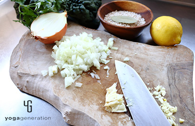 鍋にオリーブオイルと1の玉ネギを入れ、中火で炒める。玉ネギが透明になり甘い香りがしてきたら、1のニンニクを加えて更に炒める。 -