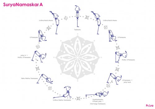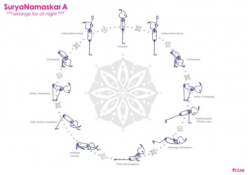 というわけで、朝向きの太陽礼拝と、夜向きの太陽礼拝、そのアレンジ例をイラストでご紹介させてくださいね♪ ひとことに太陽礼拝と言っても流派によってやり方もアーサナの順番も違いますが、とりあえずは最もベーシックな太陽礼拝のAを例にとると…