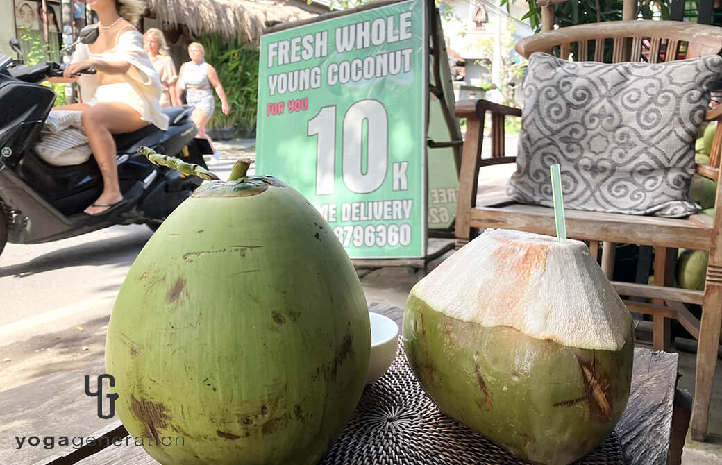 また、バリ島はフレッシュなココナッツウォーターが飲めるのも魅力!シンプルに、ココナッツの実に包丁を入れて、その隙間から果汁を頂くのですが