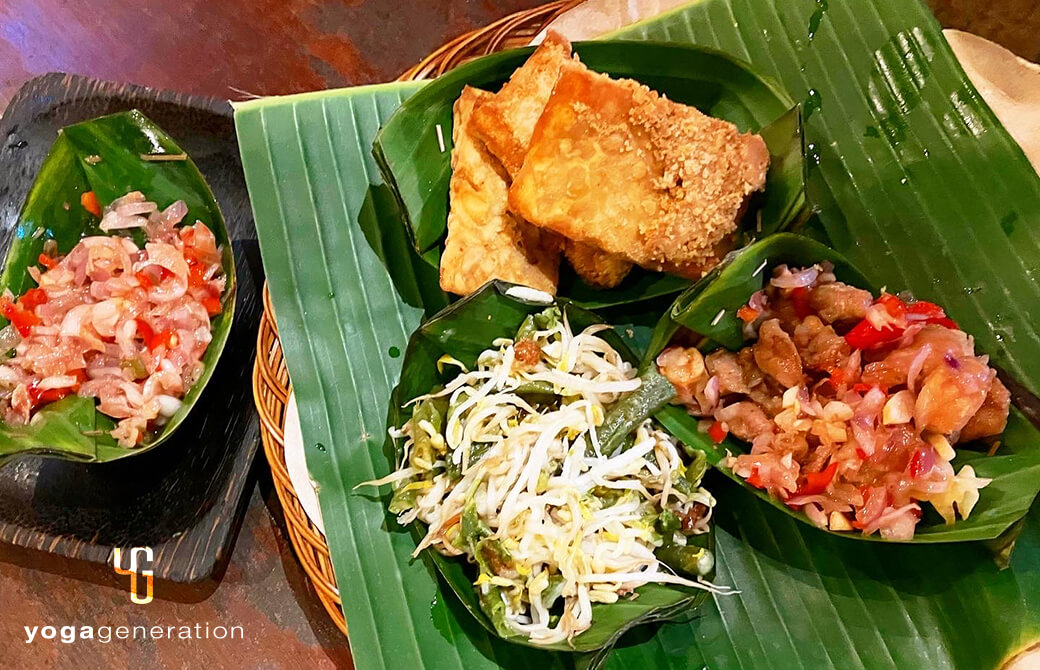 山盛りのフレッシュなサラダ(現地の人は常に火を入れたや最初食すため、フレッシュなサラダを食する習慣はありません、これはあくまでも観光客向けです)に、素揚げしたお豆腐やテンペ(大豆の発酵食)、スプラウトや湯がきワカメ、様々なナッツがトッピングされています。