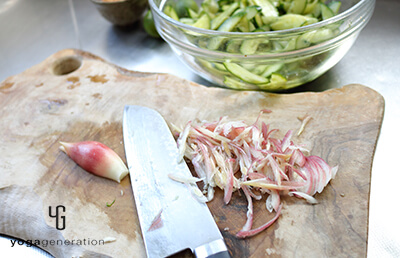 キュウリは縦半分に切り、斜めに薄くスライスする。 -