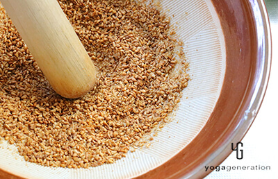 フライパンで金ゴマを弱火で炒り香りを出す。すり鉢で半ずりする(半分形が残るように荒く擦る)。 -
