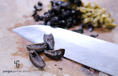 大きいボウルを用意する。オリーブは粗いみじん切りにしボウルへ入れる(縦に4等分し端から刻んでいくとやりやすい)。 -