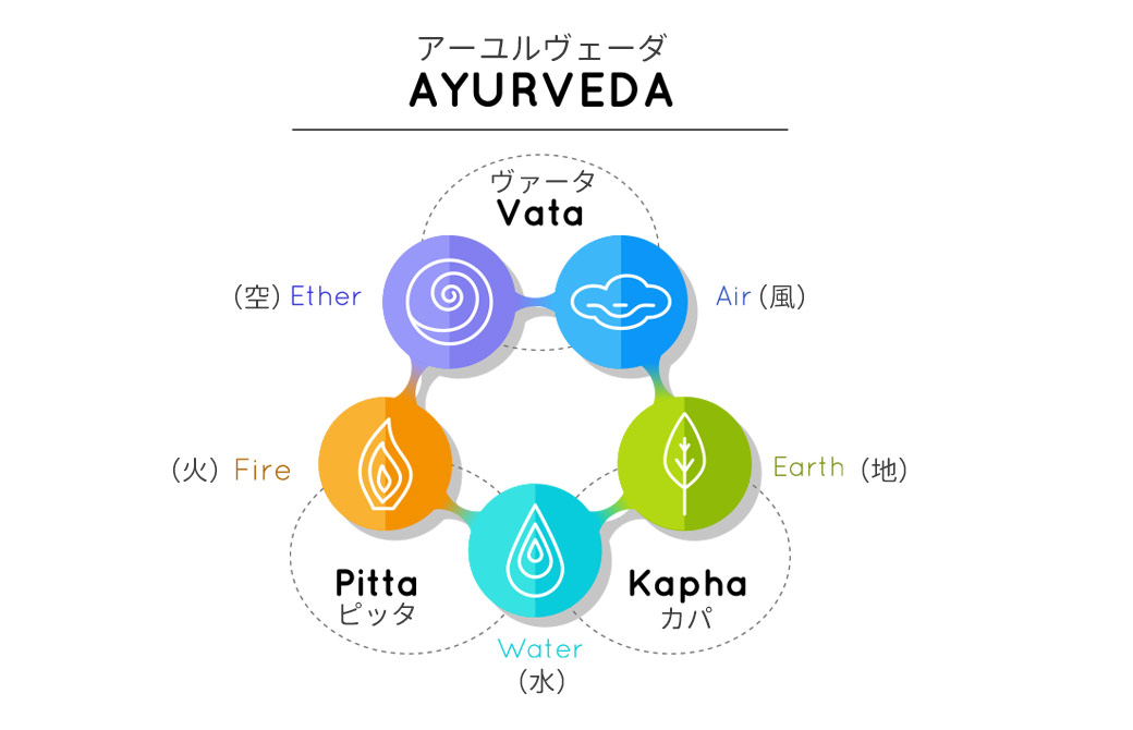 先ほど、アーユルヴェーダでは、全てのものは五つの元素(地、水、火、風、空)で出来ているとご説明しましたが、これが基となり、3つのエネルギーが存在すると考えられています。ヴァータ、ピッタ、カファという言葉、聞いたことがある、という方も多いかもしれません。