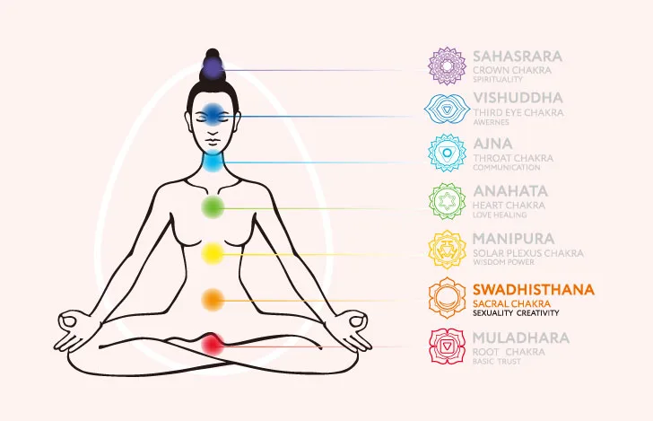 ハタヨガでは、体内の背骨沿いにある7つのチャクラについて説きますが、その中でスヴァディシュターナ・チャクラは下から2番目、仙骨の位置らへんにあると言われています。