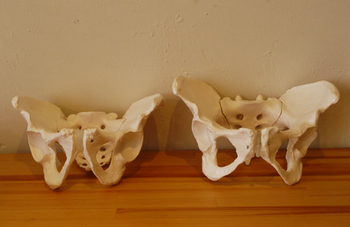 ラテン語名「Pelvis」は「たらい」という意味があるそうですが、すり鉢状の大きな骨で体の中心部にあります。その形は、骨格の中でも最も男女差のある骨です。