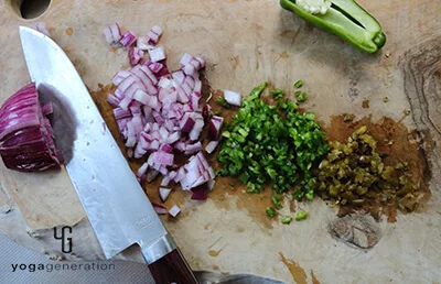 鍋に洗ったジャガイモを入れ、かぶるくらいの水を加えて塩(分量外)を投入し、蓋をして茹で始める。その間にサルサの材料をみじん切りにするが、素材によってみじん切りする大きさを変える。ニンニク、ハラペーニョピクルスはごく細かく細かくみじん切りに。ピーマンは種を取り除く。このピーマンはニンニクとハラペーニョよりも少し大きめのみじん切りに。紫タマネギは2〜3mm角のみじん切りにする。みじん切りにした材料は大きめのボウルなどに入れ塩を振り、ライム果汁を絞り入れて軽く混ぜ合わせておく。