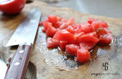 仕上げの段階で混ぜ合わせていると、トマトの形が消えフレッシュさが無くなってくるので、カットするときは出来る限りトマトの原型を残すようにするのが大事なポイント!仕上がりがとっても美味しいです!