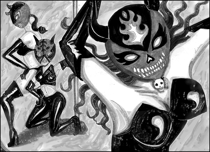 マダムYUKOとネコが紫色のペンキを塗っているイラスト