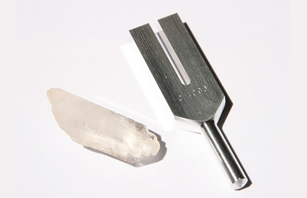 アルミでできた音叉(チューナー)と水晶ポイント(水晶の結晶原石)を一緒に使うのですが、チューナーで水晶ポイントを叩くと、高く澄んだ音の波動が出ます。