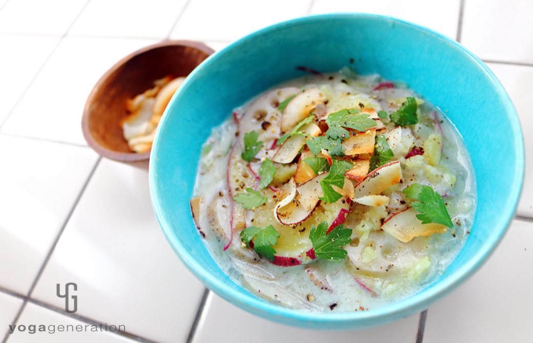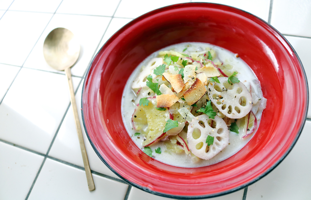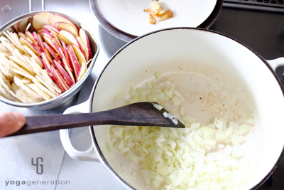 タマネギを入れて半透明になるまで炒める。レンコンとサツマイモを加えて塩・黒胡椒を振り入れ、ざっと混ぜ合わせたらココナッツミルクと水(分量外)、カルダモン、ローリエを加えて加熱を続ける。 -
