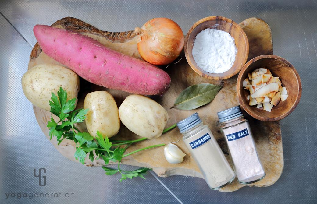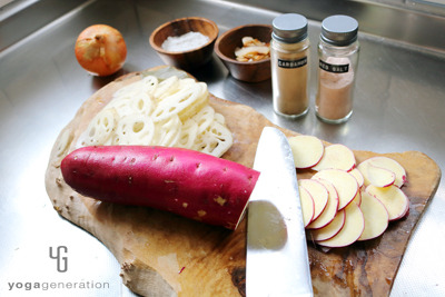 レンコンとサツマイモは薄切り、タマネギは粗いみじん切りにする。ニンニクは包丁の腹で潰す。 -