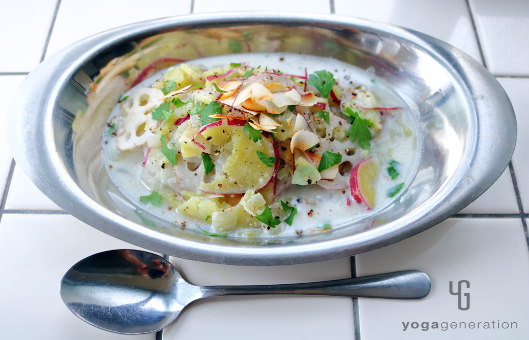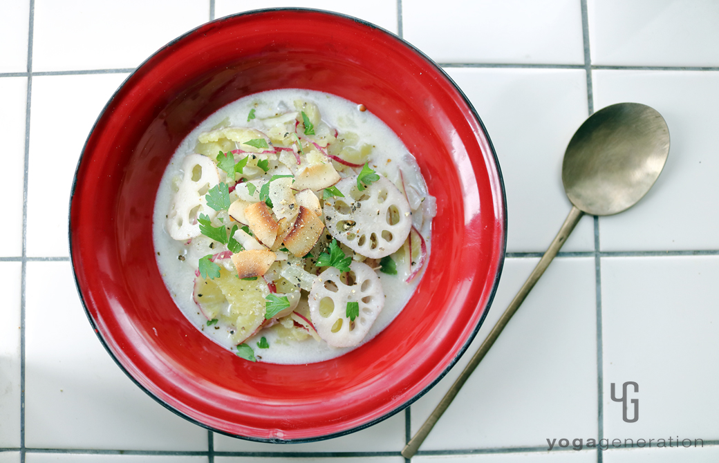 レンコンのホクホク&シャキシャキ感と、半分溶けたサツマイモのトロ〜リ感がたまりません♪カルダモンの香りが素材たちの魅力を引き立てていますよ!まずはサツマイモの紅の皮の色に合わせて赤い器に。