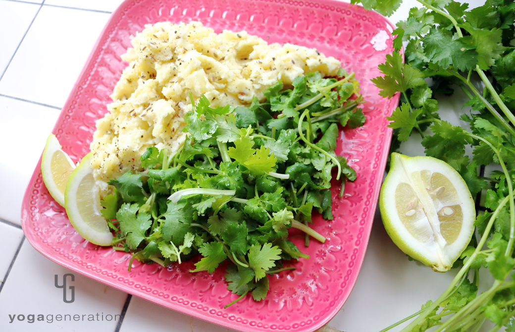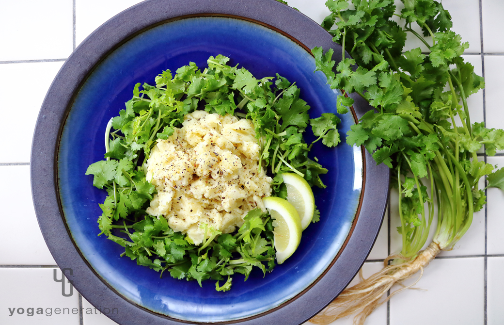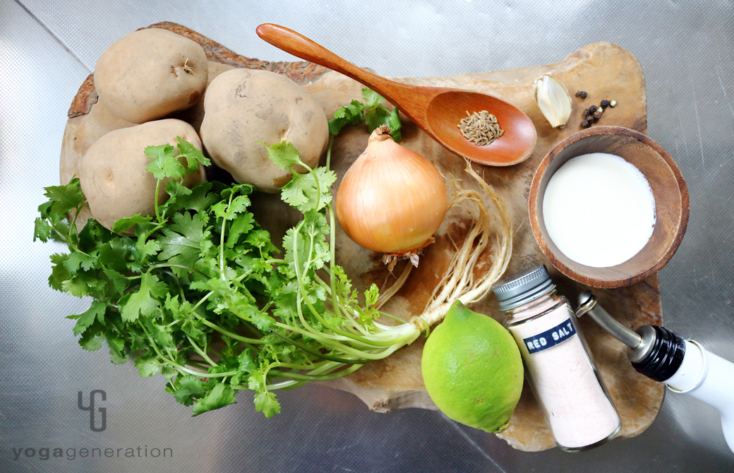 ジャガイモはよく洗い、皮付きのまま茹で始める。パクチーはざく切り、玉ネギは粗いみじん切り、ニンニクはすりおろす。 -