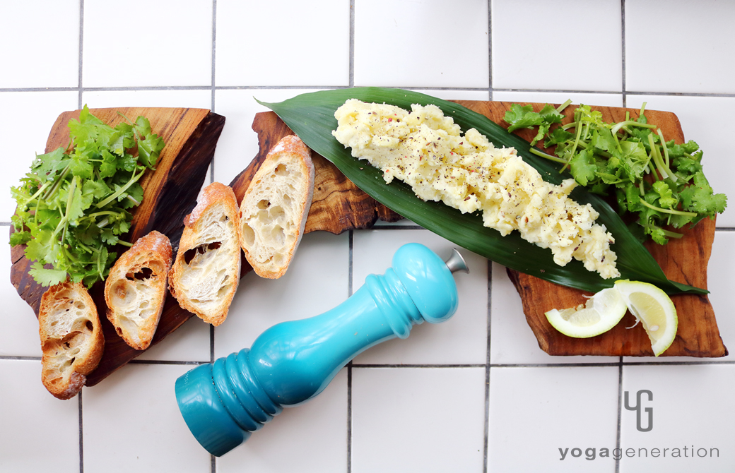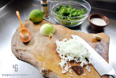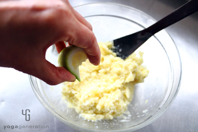 2に1の玉ネギとニンニク、生クリーム、塩、粗く砕いた胡椒を加えて混ぜ合わせ、仕上げにレモンをギュッと絞って香りをつける。 -