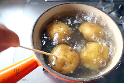 ジャガイモは竹串などがスッと通るまで茹でる。茹で上がったら熱いうちに皮をむいて潰す。 -