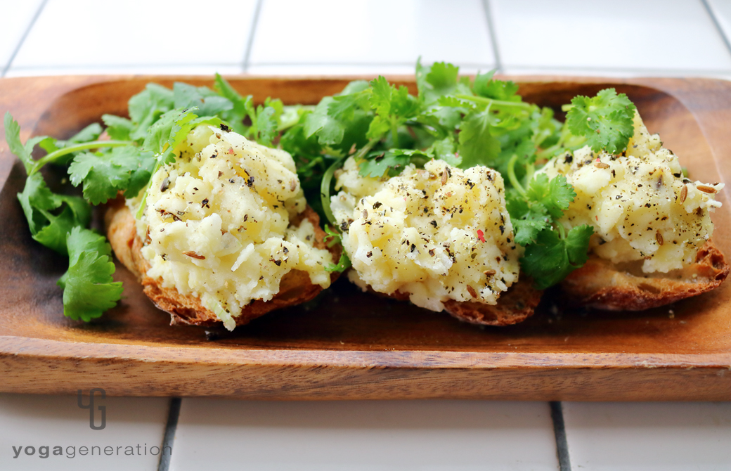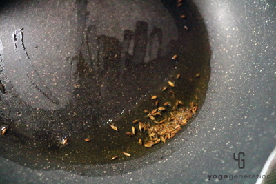 フライパンにエキストラヴァージンオリーブオイルとクミンを入れて弱火で温め始める。小さな泡が出始めパチパチと音がしたらすぐに火からおろし、3に加えて混ぜ合わせる。 -