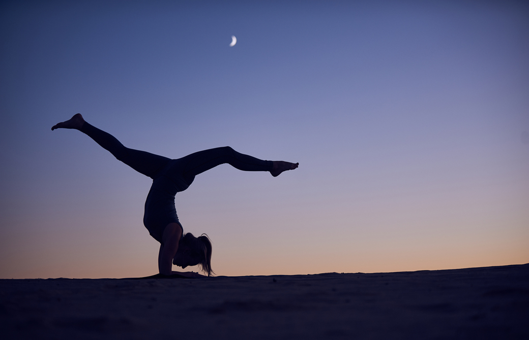 半月のポーズはご存知の通り、身体を横に開きバランスを取る大胆なポーズです。全身を大きく見せるように広げ、バランスに集中しキープします。