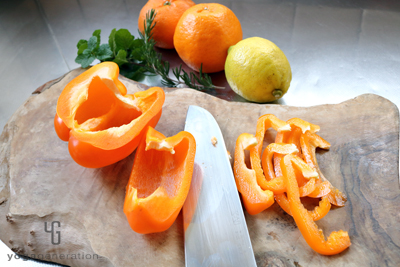 オレンジ・パプリカは種を取り除き縦長にスライスする。 -